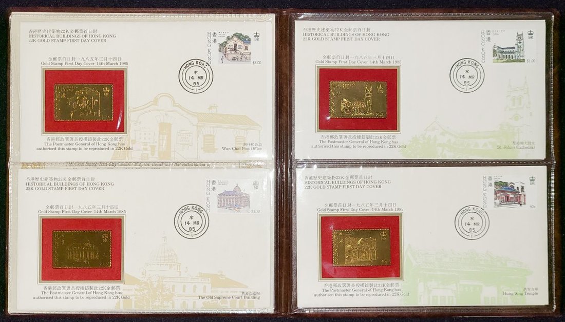 1985 (14 Mar.) Historical Buildings of Hong Kong 22K Gold Stamp full set of 4 First Day Covers in original album with certificate.