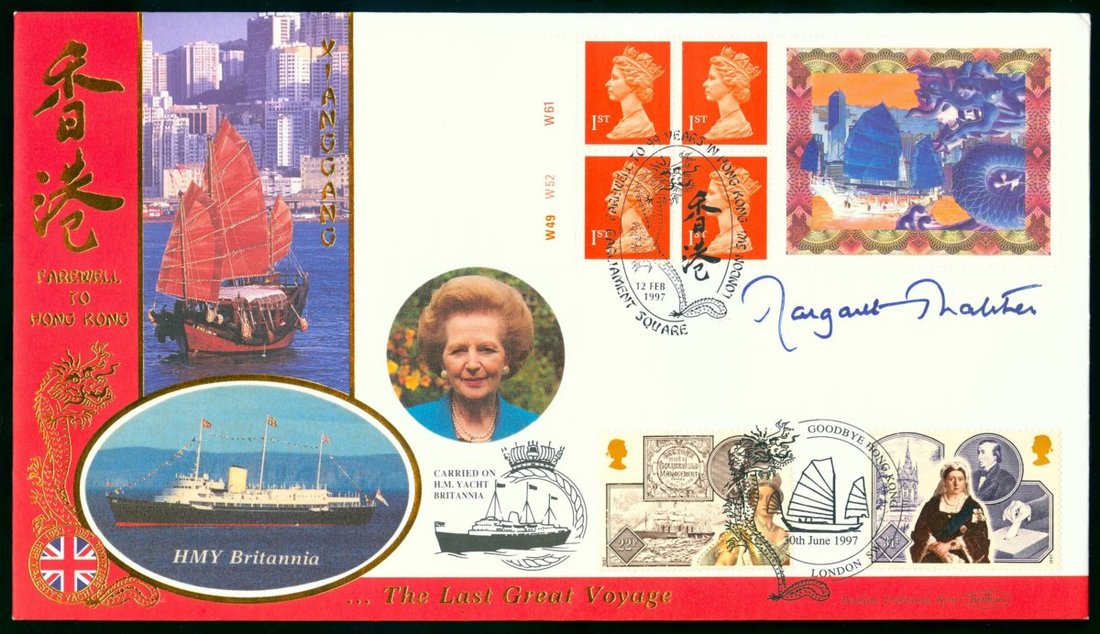 1997 (12 Feb.) MARGARET THATCHER SIGNED "Farewell to Hong Kong" beautiful Benham silk and gold detailed cover bearing various G.B. stamps with special farewell / Goodbye illustrated d.s., H.M. Yacht Britannia silk panel and Britannia cachet, with "The Last Great Voyage" inscription at bottom.