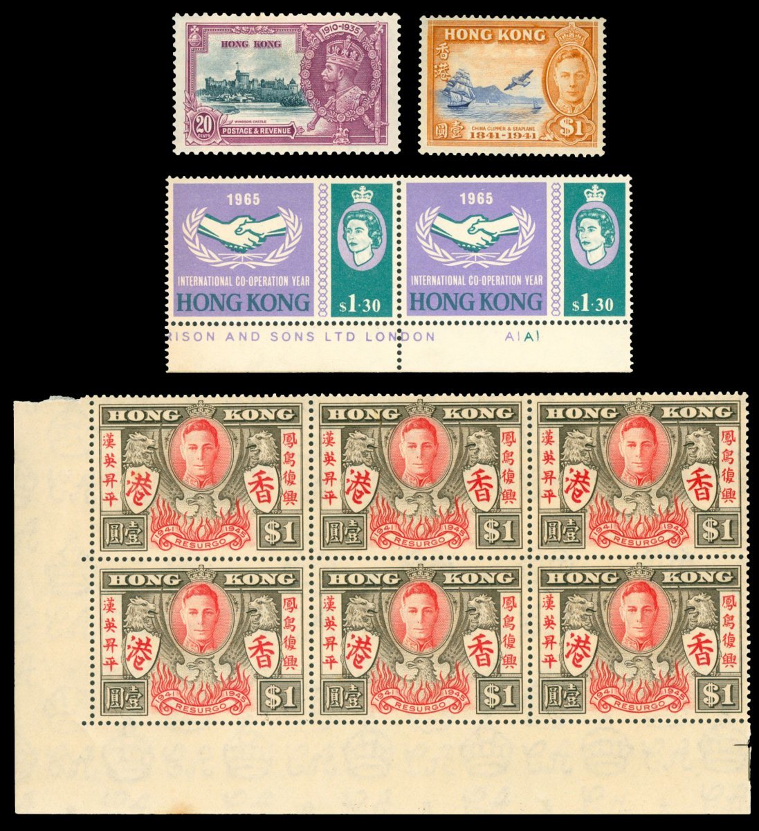 1935-67 a group of Hong Kong commemorative & Special Issues in set; Including 1935 Silver Jubilee (2 sets), 1941 Centenary of British Occupation (2 sets), 1946 Victory Issue (2 sets), 1965 International Co-operation Year (2 sets in pair), and others, please preview. (70)