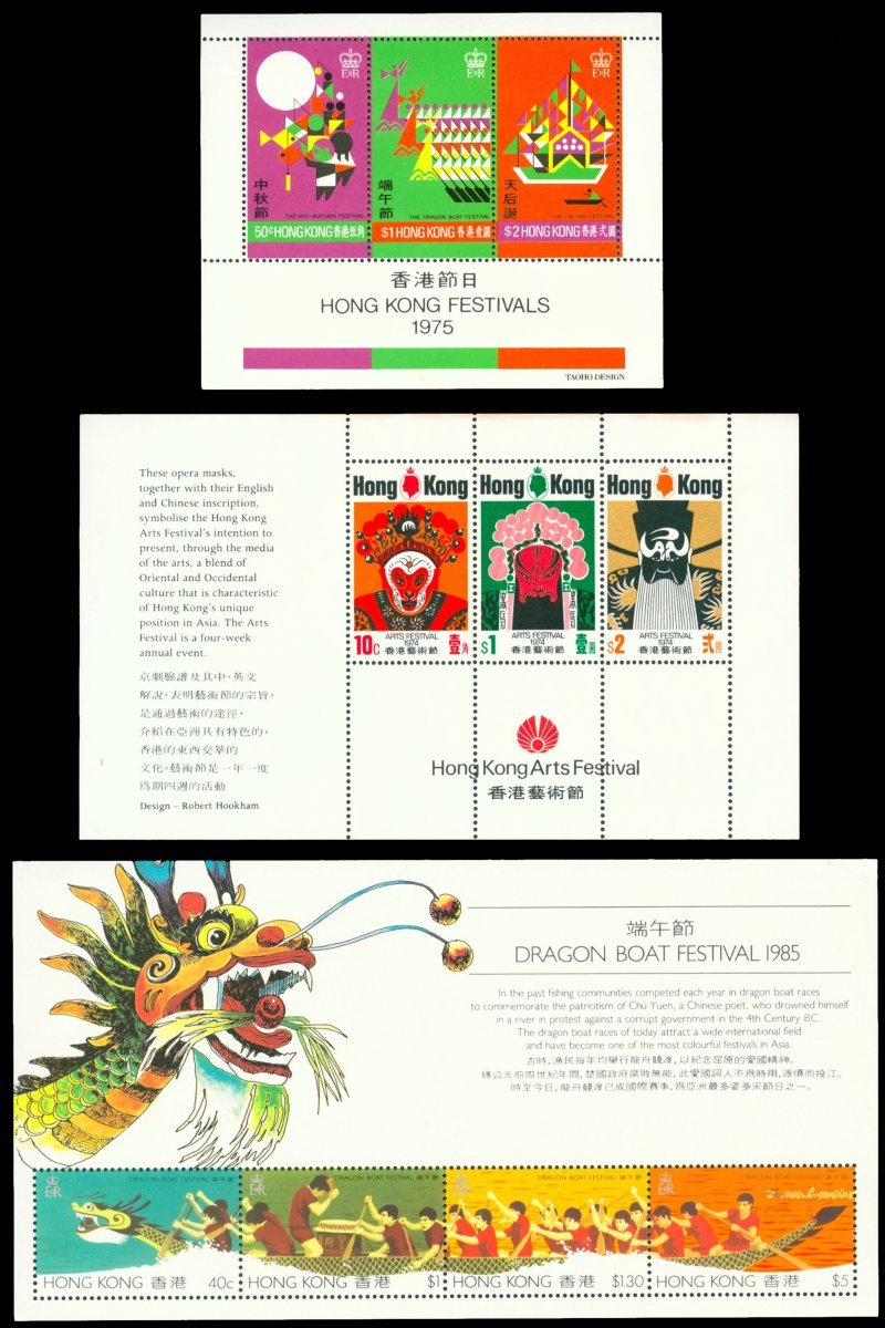 1970s-80s a group of souvenir sheet issues; including 1974 (Feb.) Arts Festival of Hong Kong (3)., 1974 (July) Hong Kong Festivals (5), 1981 (Oct.) Public Housing (10), 1984 (Nov.) Royal Hong KOng Jockey Club (10), 1985 (June) Dragon Boat Festival (10), 1986 (Feb.) Comet Halley (10) and 1989 (Nov.) Royal Visit (6). All in fine condition.