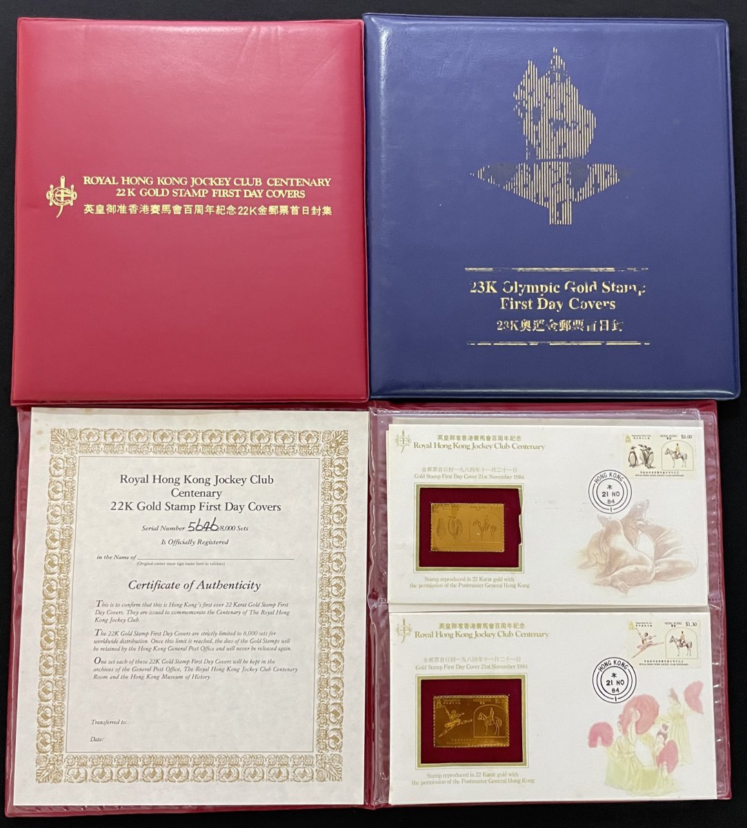 1980-90年代香港各種金郵票首日封紀念冊共23 本; 包括1894年香英皇禦准港馬會百週年紀念, 1985年香港歴史建築物, 1997 香港特別行政區成立紀念及年度生肖紀念等等.