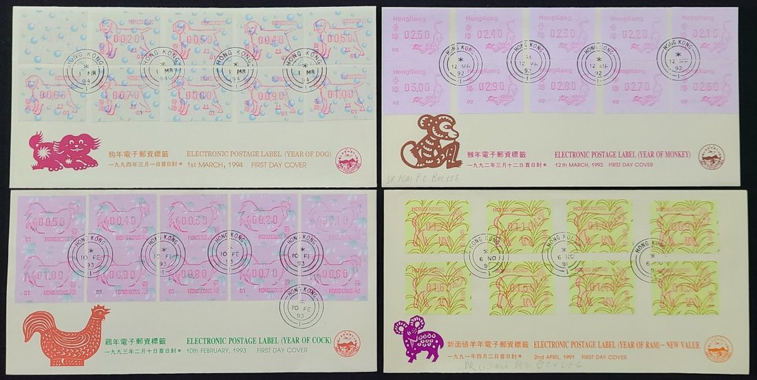 1991-94, 98 (Year of Ram, Monkey, Cock, Dog, and Tiger) Frama Labels Issue F.D.C., covers issue by Hong Kong Post Office or China Philatelic Association. Total about hundreds of pieces.