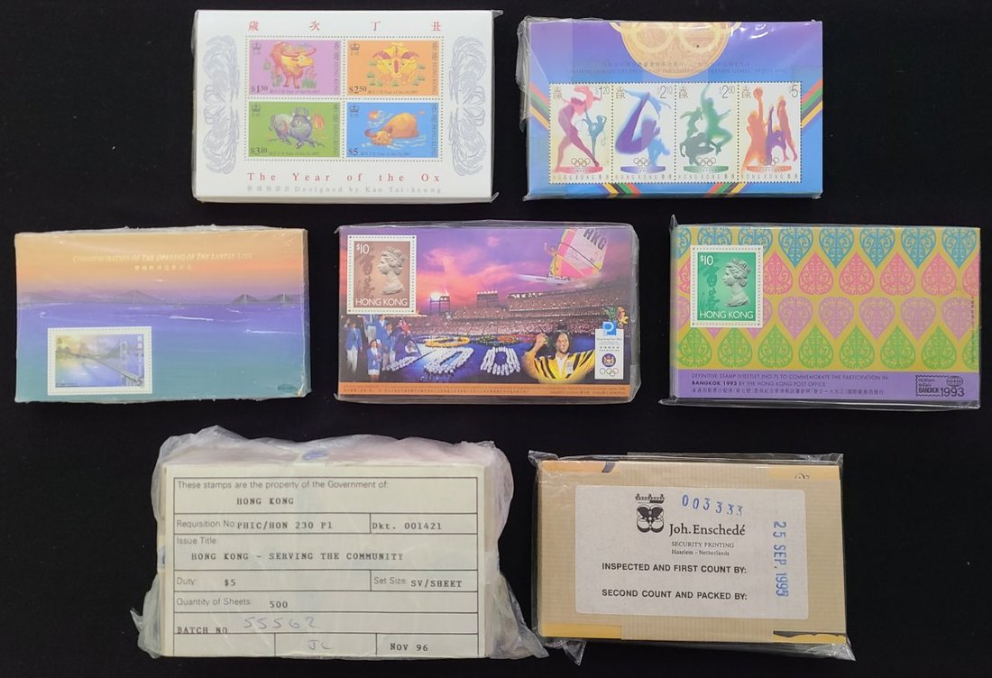 1995-97 a group of Souvenir Sheets; Including 1993 (C67M) "Bangkok 93" 200 sheets, 1995 (C77M) Commemorate the End of the WWII 100 sheets, 1996 (C79M, C81M) Olympic Games 300 sheets, 1996 (C83M) Lee Lai Shan 500 sheets, 1996 (S76M) Serving the Community Week 500 sheets, 1997 (S77M) Year of Ox 200 sheets and 1997 (S79M) Modern Landmarks 200 sheets.