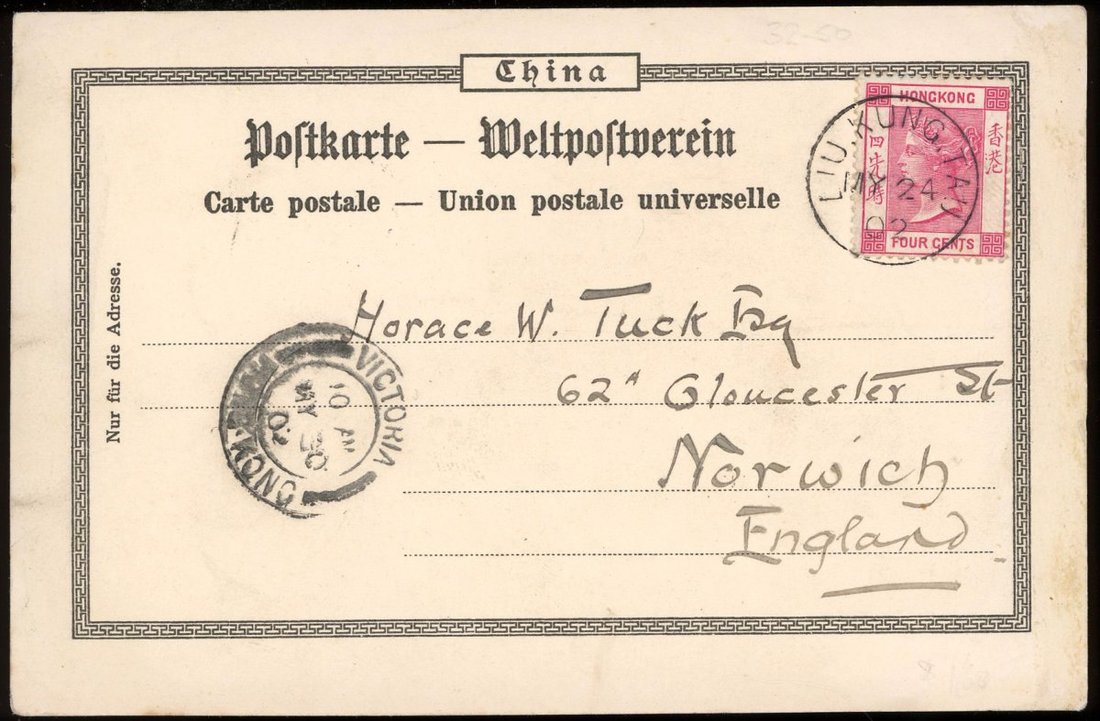 1902 ( 24 May) postcard to England bearing Hong Kong 4c. tied by Liu Kung Tau c.d.s., Hong Kong transit c.d.s. (30.5) on the reverse. Scarce mail from Liu Kung Tau to England via Hong Kong.