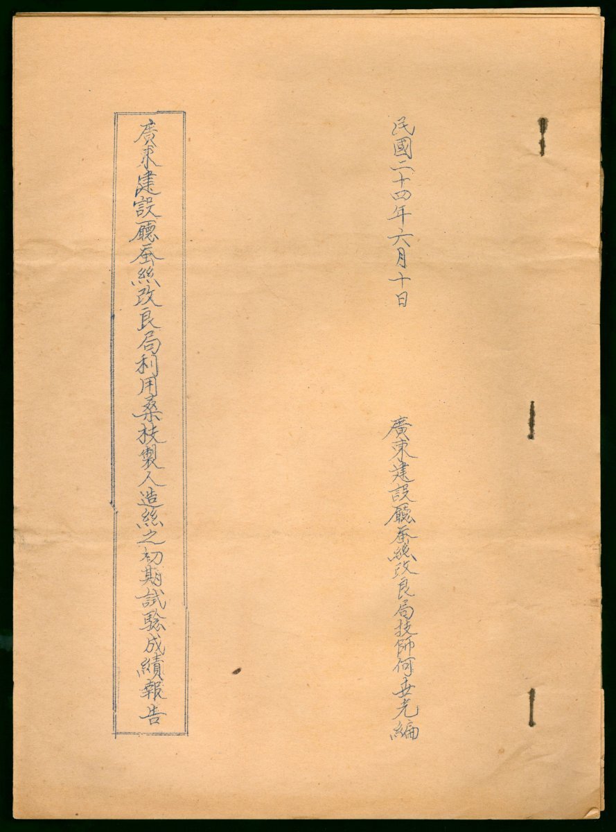 1935年6月10日廣東建設廳蠶絲改良局人造絲初期試驗成績報告書一份. (油印本)