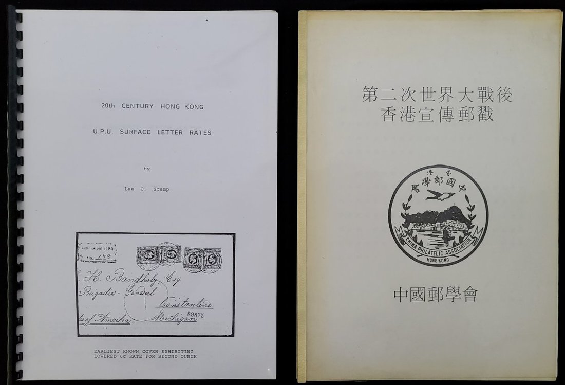 1980s The "Postmark for Hong Kong Post-World War II Propaganda Postmark" printed by the Chinese Philatelic Society of Hong Kong, limited to 150 copies, No. 143; And 1987 "20th Century Hong Kong U.P.U. Surface Letter Rates" edited by Lee C. Scamp. Printed in the U.S.