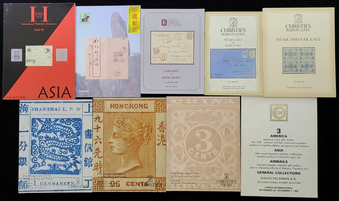 1982-2014 total of 8 stamp auction catalogues of different auction companies and one volume of China Post History (2001, Dec.)