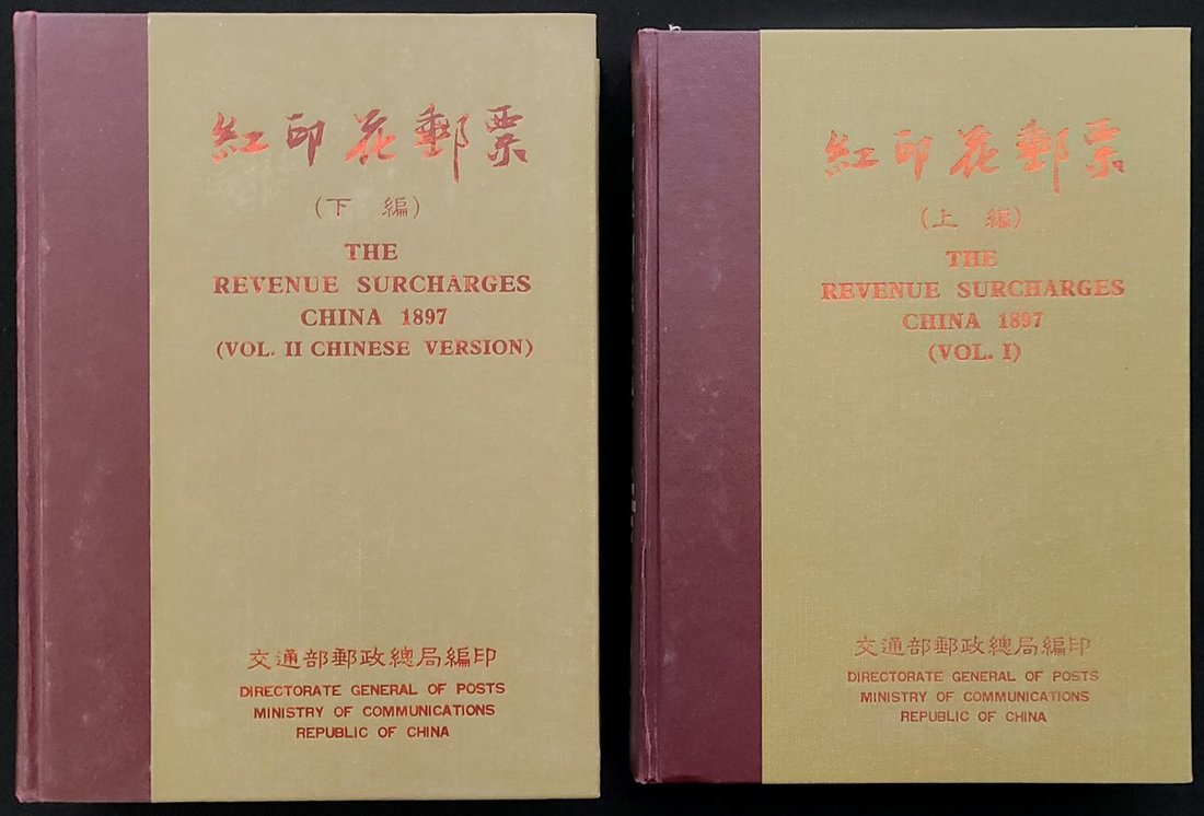 1984-1987 "The Revenue Surcharges China 1897 Vol.1 and 2; Hardcover with book cover. Compiled and printed by Directorate General of Posts Ministry of Communications, R.O.C.