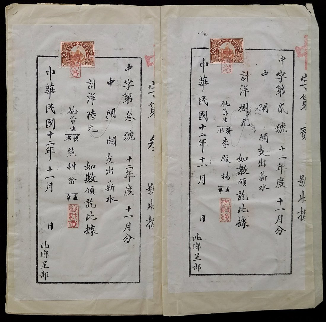 1923 (Nov.) The Zhongzha Sub-Customs Bureau's receipts sticky book, which contains 26 receipts, most of them with Great Wall one-cent tax stamps of the Republic of China. Rare.