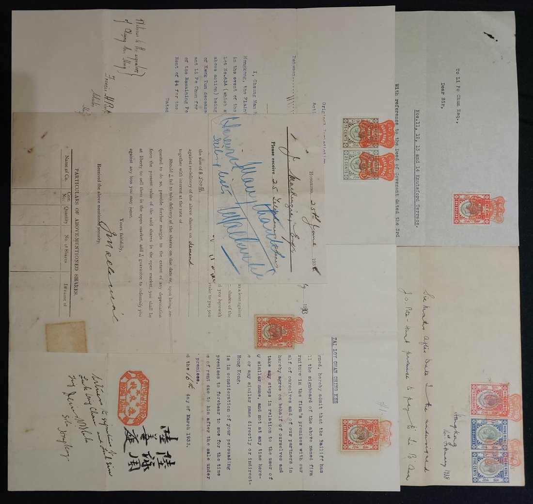 1915-38 total of five copies of the mortgage agreement and the receipt of the purchase of the Hong Kong Telephone Company shares. Each affixed with Hong Kong tax stamps of different denominations.