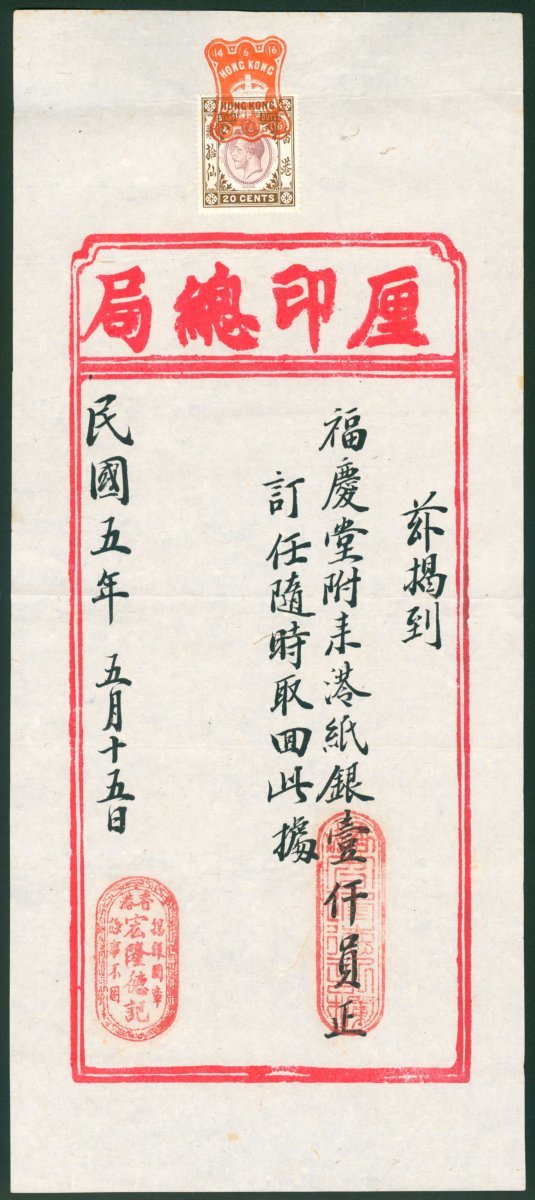 1916 a stamp duty receipt, adhesive 20c. revenue stamp at top centre. very fine.