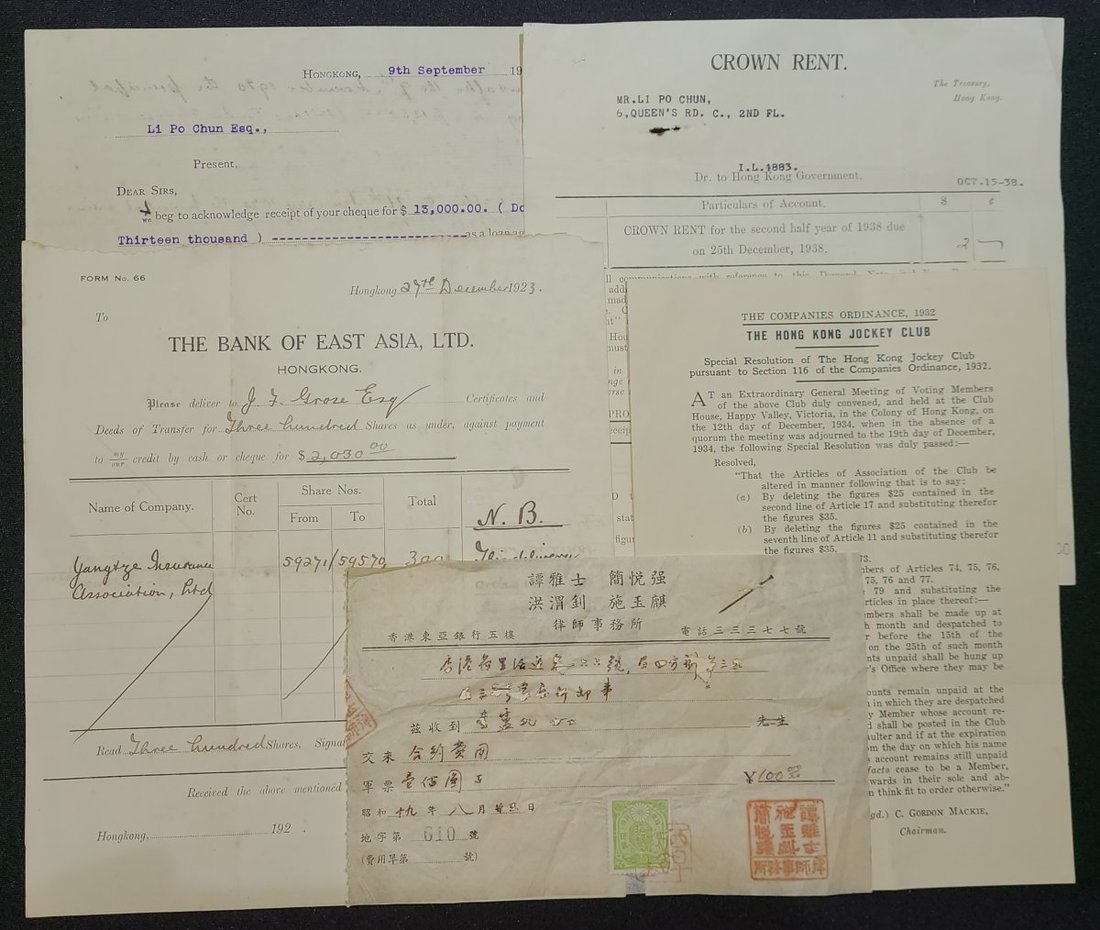 1920-44 Five receipts from Hong Kong; including the receipt from Kan Yuet-Keung Lawyer's office during the Japanese occupation period, with Japanese 10s tax stamps, and two receipts belonging to Li Po Chun.