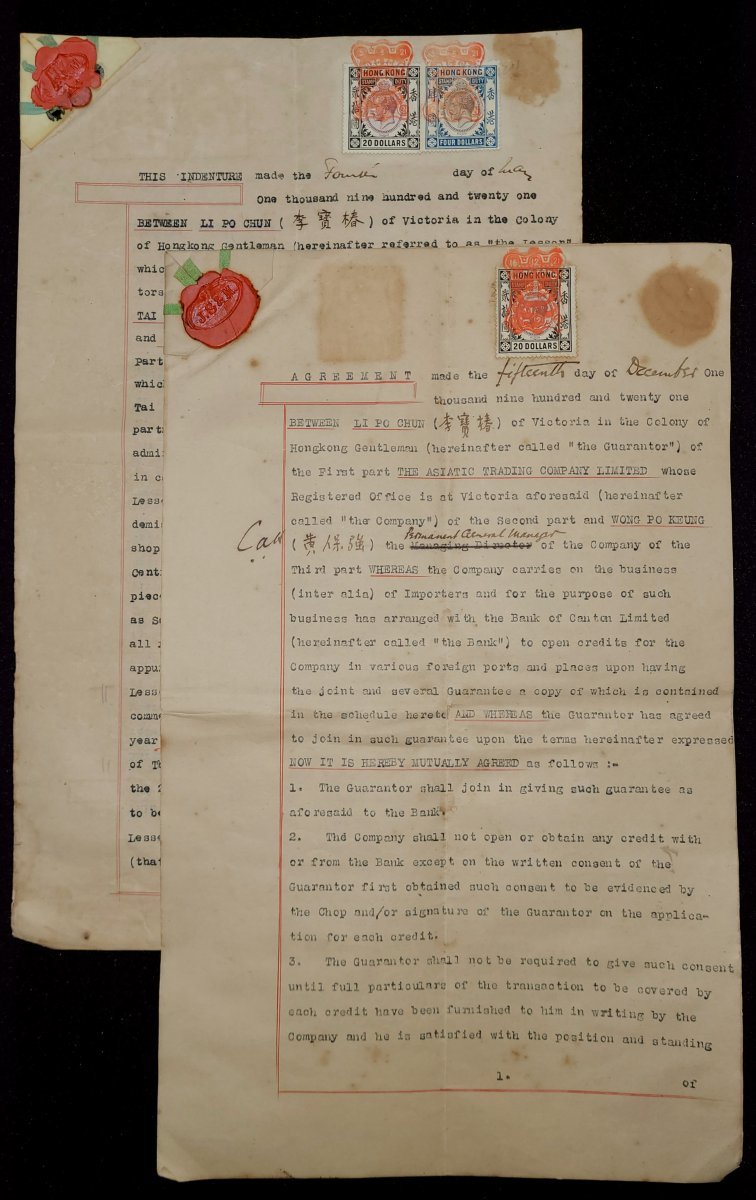 1921 Two real estate contracts, both signed by Li Po Chun. A total of $20 and $26.5 Hong Kong tax stamps are posted respectively.
