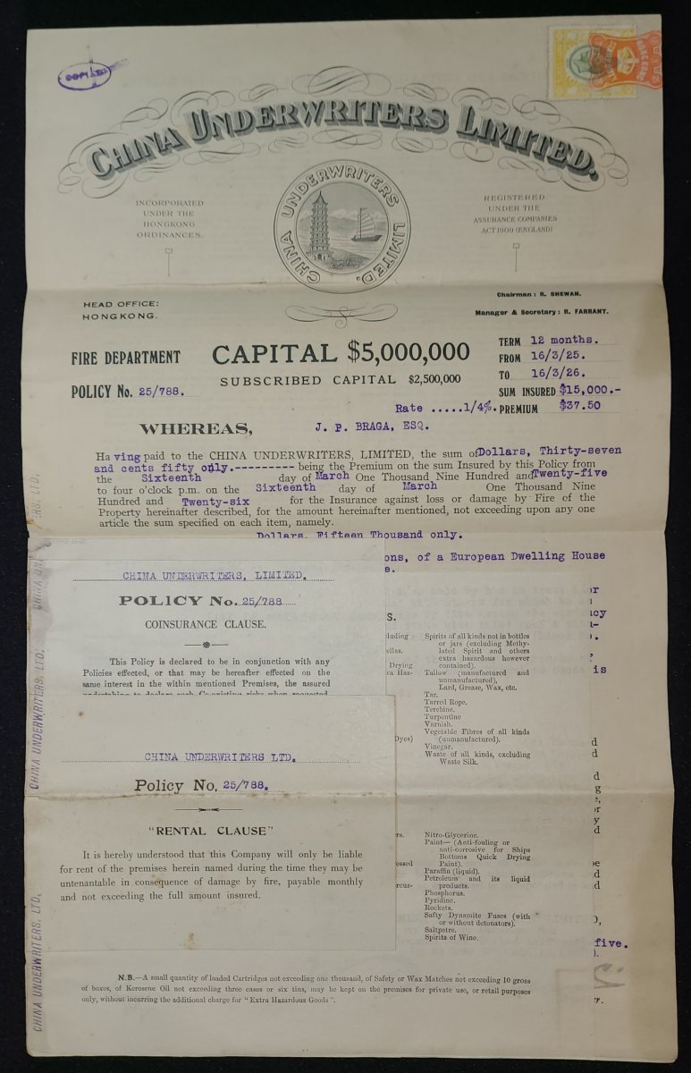 1926 (18 Mar.) A China Underwriters Limited insurance policy. Policy No. 25/788, with a Hong Kong tax stamp 50c.