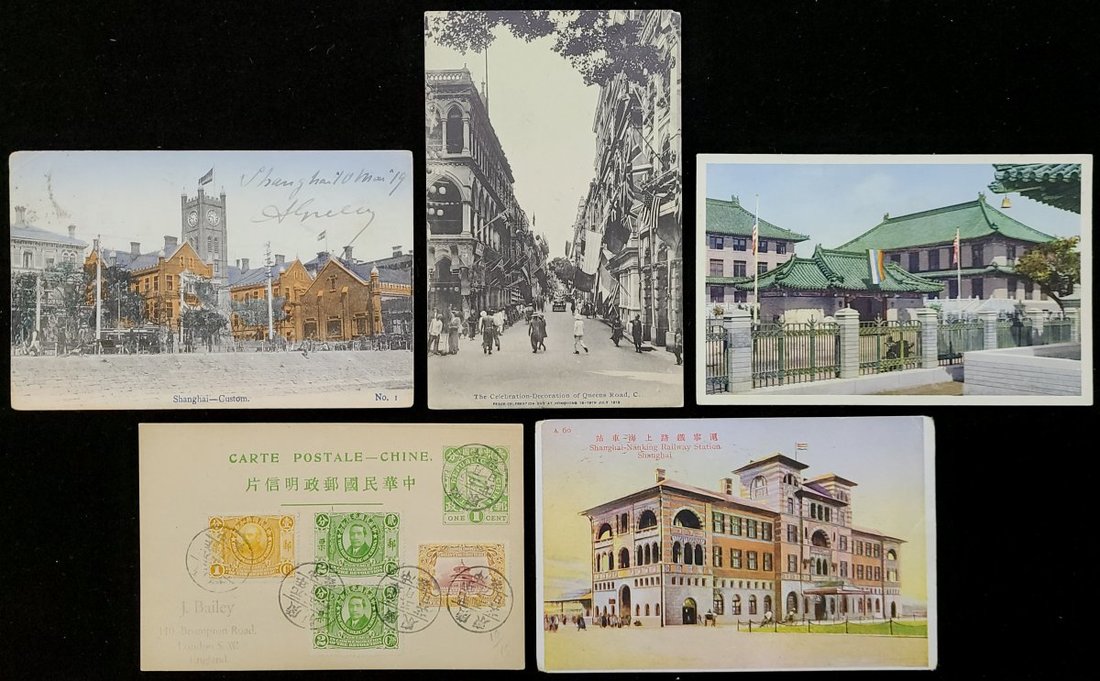 1910s four postcards with a five-color national flag in the early Republic of China (two in Shanghai, one in Hong Kong and one in Peking Union Medical College Hospital), and one 1c. postal card, mixed franking 12c. (Hsuan Tung First Year 7c.,Dr. Sun 2c. x 2, Yuan Shih Kai 1c.), tied by 1912 (26 May) Chong Wan, Canton c.d.s.