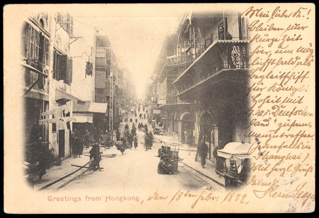 1899 (25 Feb.) picture postcard to Germany, Wellington street in Hong Kong.