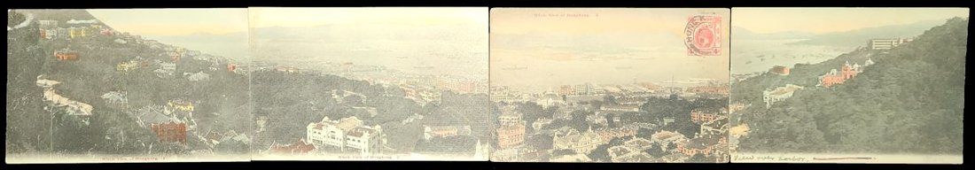 1922年香港維港全景相連明信片全套四片, 其中一片貼KE VII 4c.票一枚.