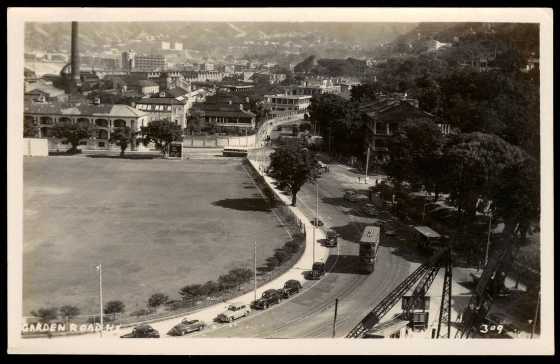 1930s real photo postcard of Garden Road and Cricket Club (now Chater Garden) on Hong Kong Island.