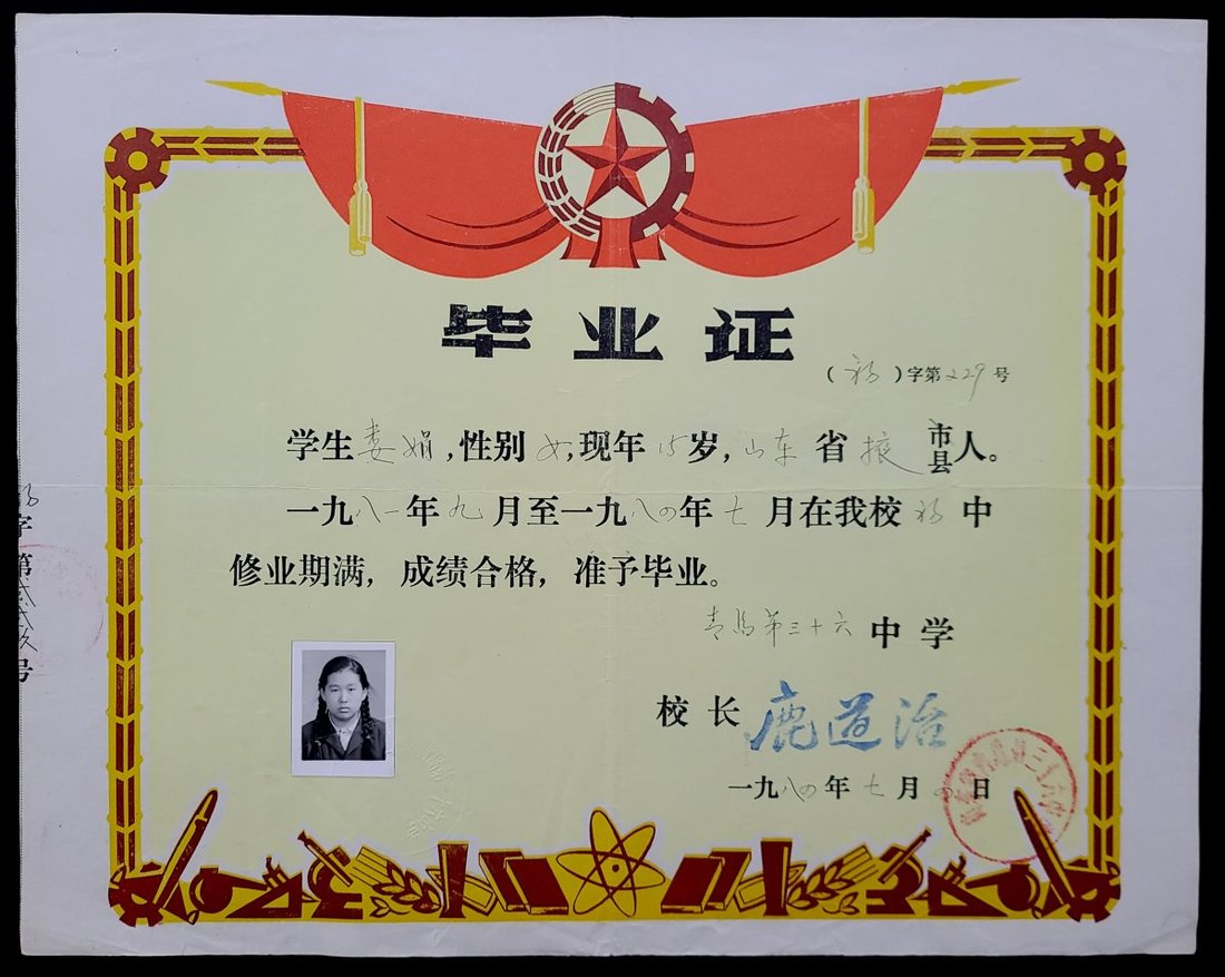 1984 (July) Graduation certificate of Qingdao 36th Middle School, with student photos.