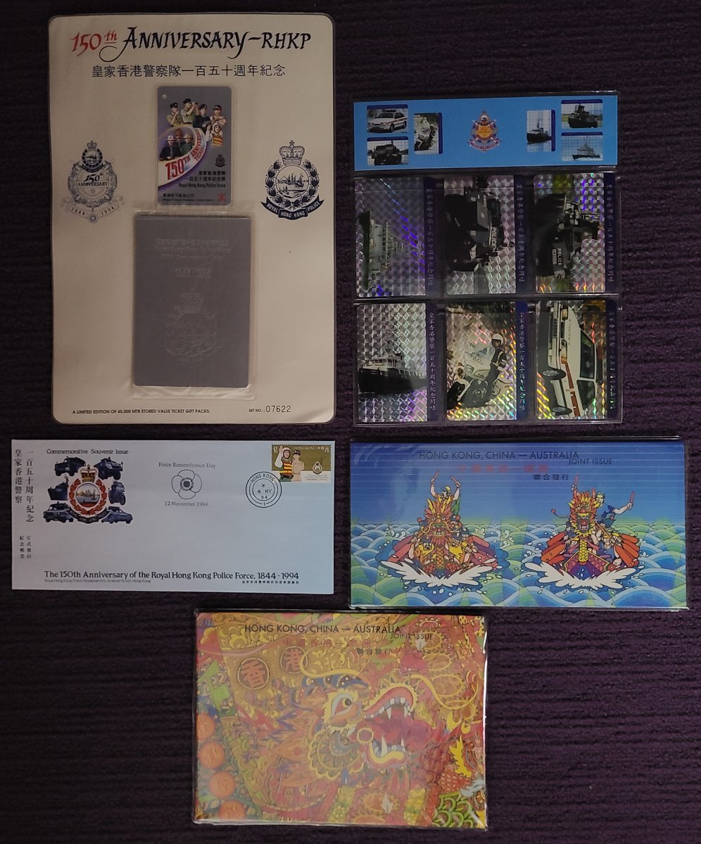 1994年香港員警成立150 週年紀念閃卡及首日封一批(含地鐵紀念票), 另有2001年香港-澳洲聯合發行"龍舟競賽"小型張共20 套.