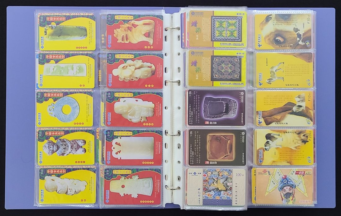 2000年代中國電話卡收藏冊, 內含古玉, 古瓷, 古銅器及楊尚昆等題材電話卡, 部份為新卡. 共三百四十枚.
