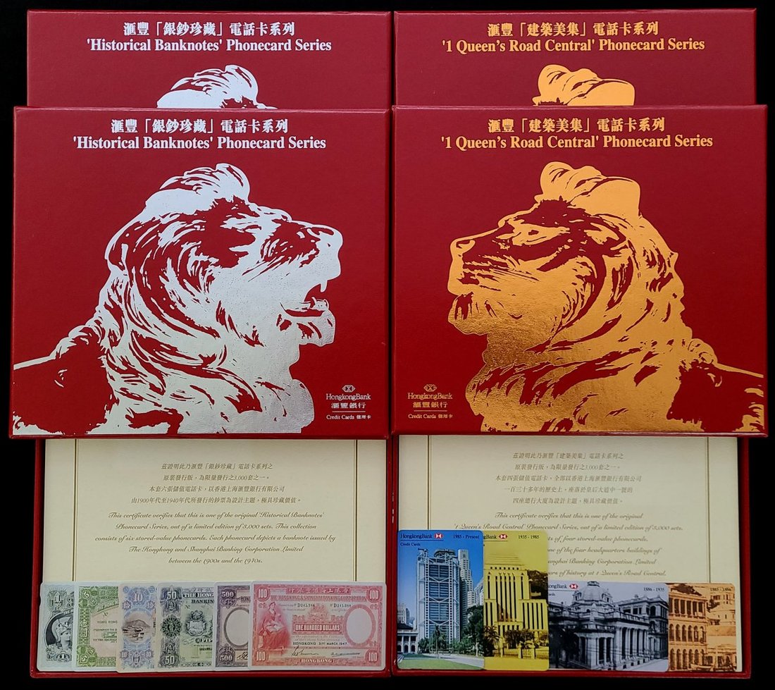 滙豐銀行「銀鈔珍藏」及「建築美集」電話卡系列收藏套裝名兩套. 每發行量只3.000 套. 均帶編証書.