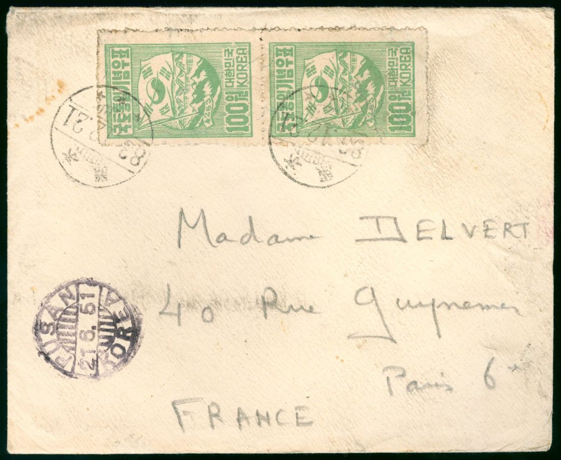 1951 envelope to France bearing 1950 Unification of Korea 100W pair, showing Pushan c.d.s. (21.6).
