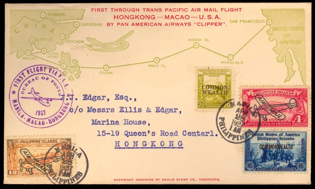 1937 (28 Apr.) to Hong Kong "Firsy Flight Cover of Hong Kong - Macao- U.S.A" by Pan American Aireays "Clipper", with four Philippine Islands stamps.