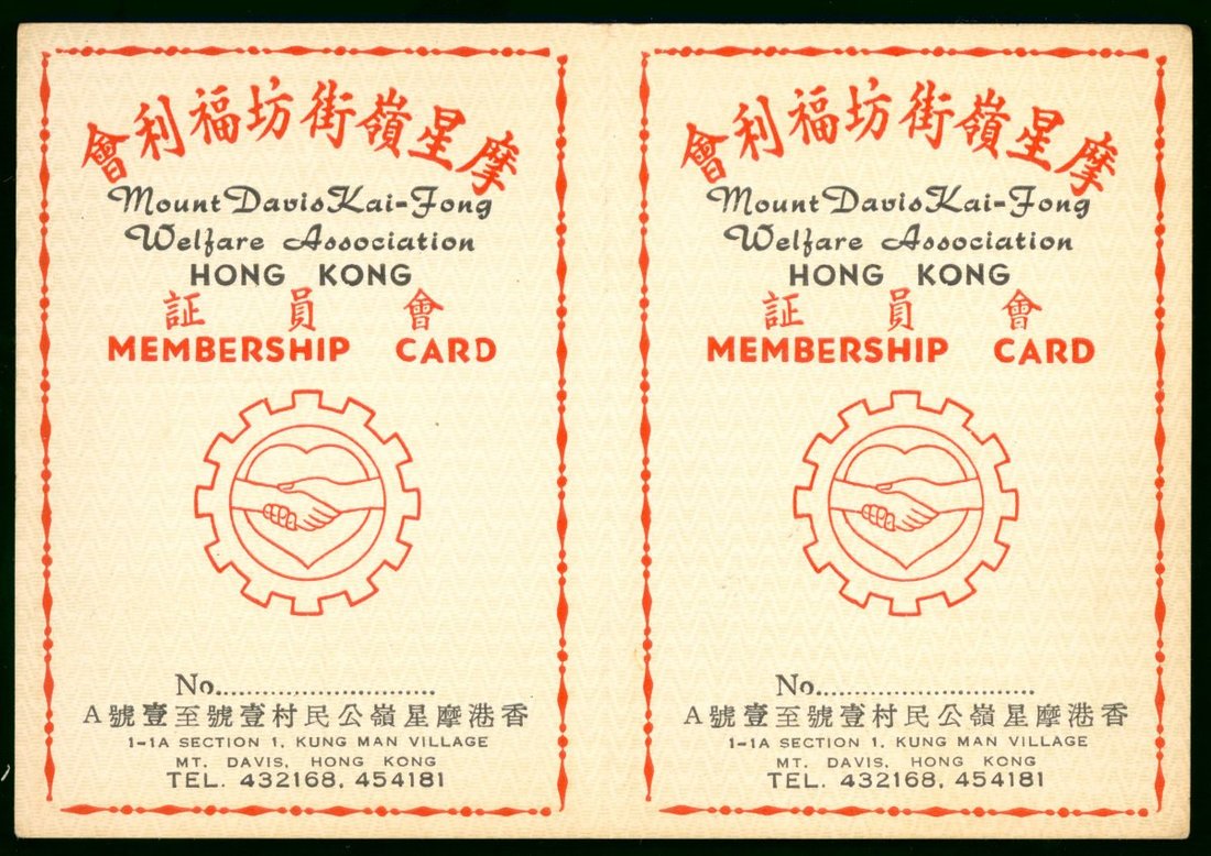 1960s Membership Card of Mount Davis Kai-Fong Walfare Associstion. Hong Kong.