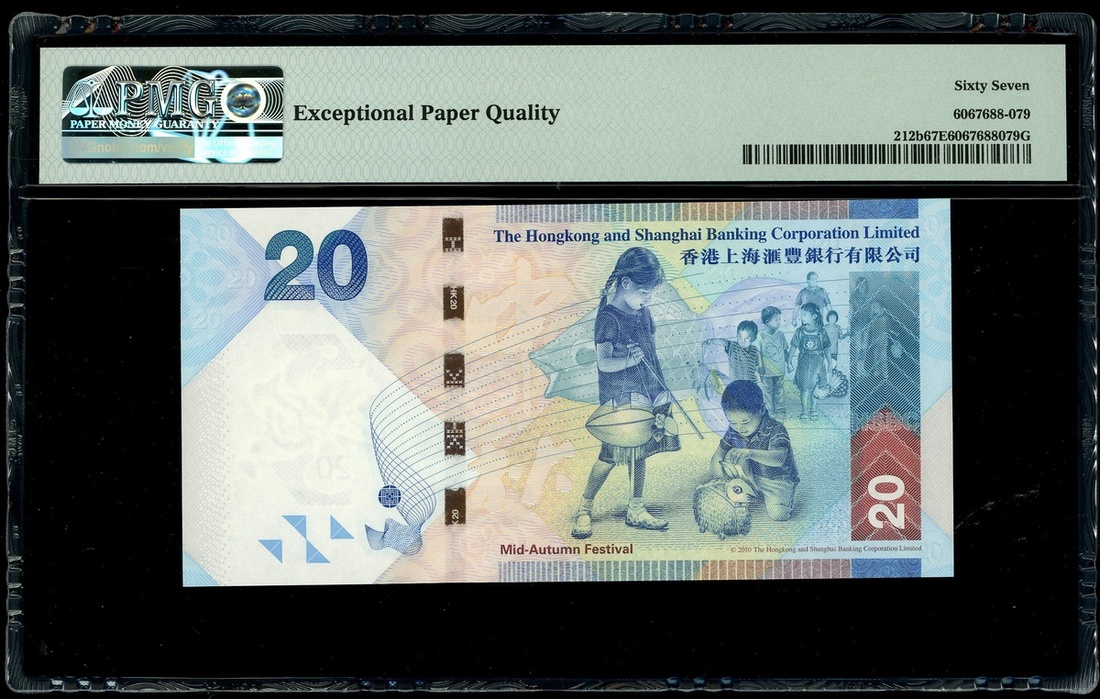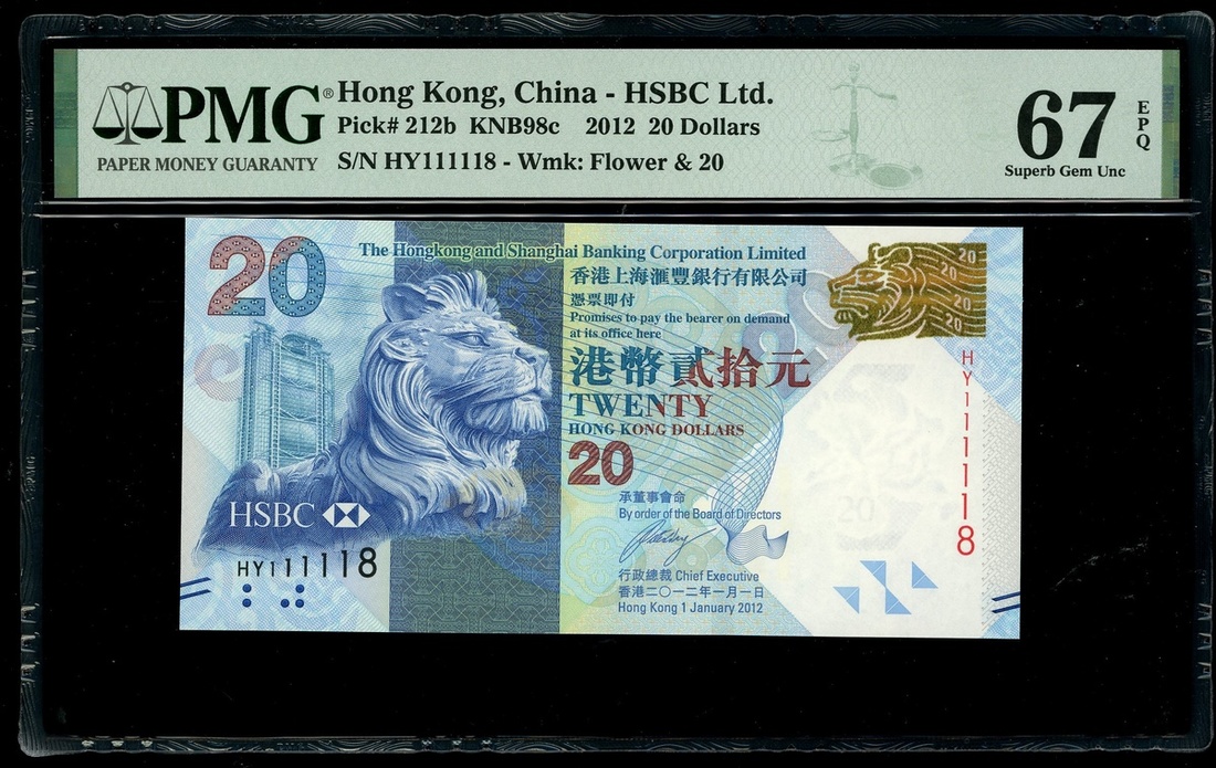 2012年香港匯豐銀行 20元,近乎全1編號HY111118,PMG 67EPQ