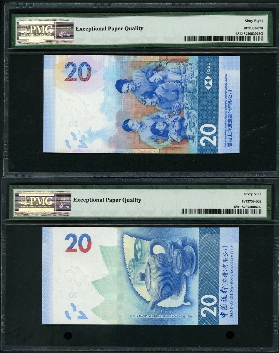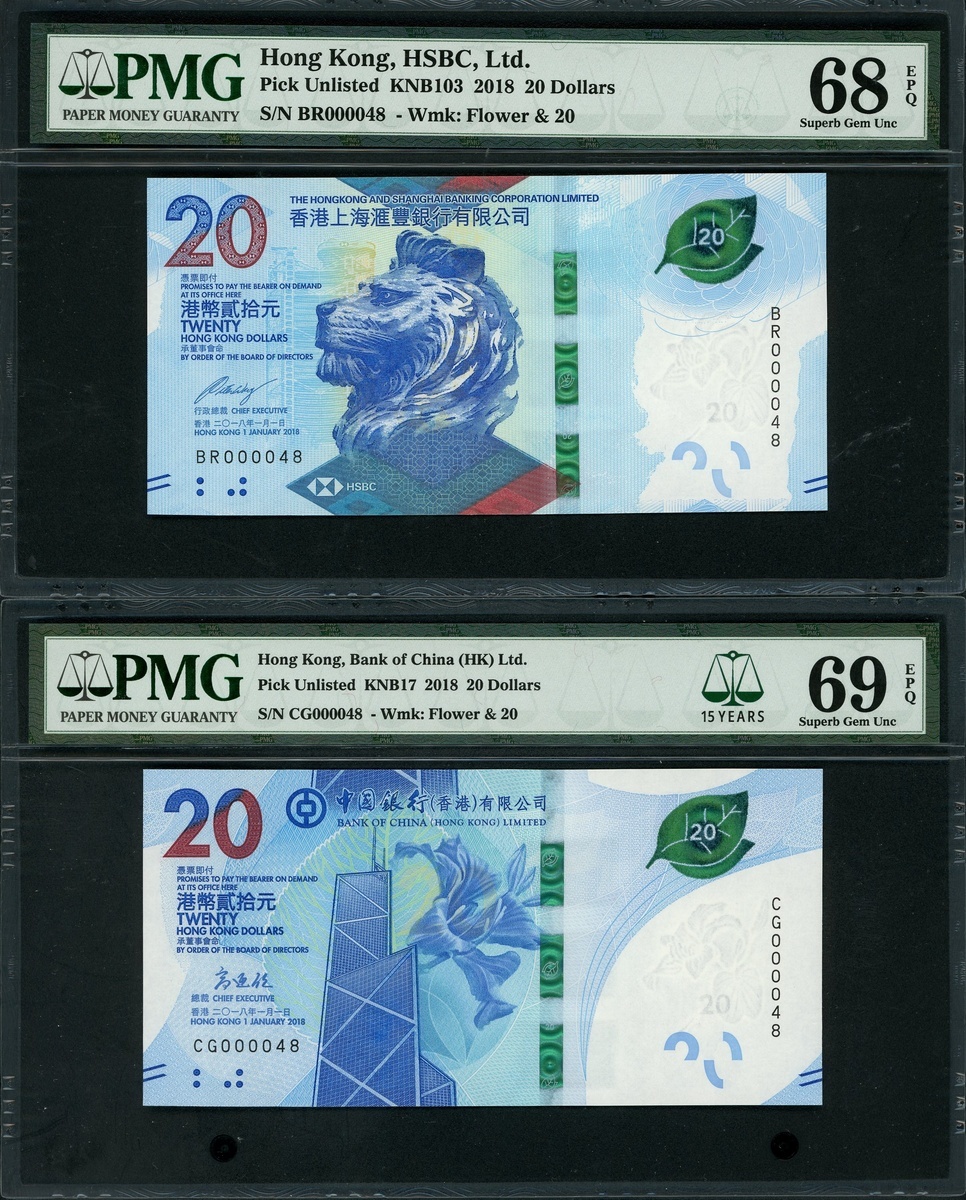 2018年香港 20元一對,相同細號 BR000048及CG000048,分別來自中國銀行及匯豐銀行,分別評 PMG 68EPQ及69EPQ