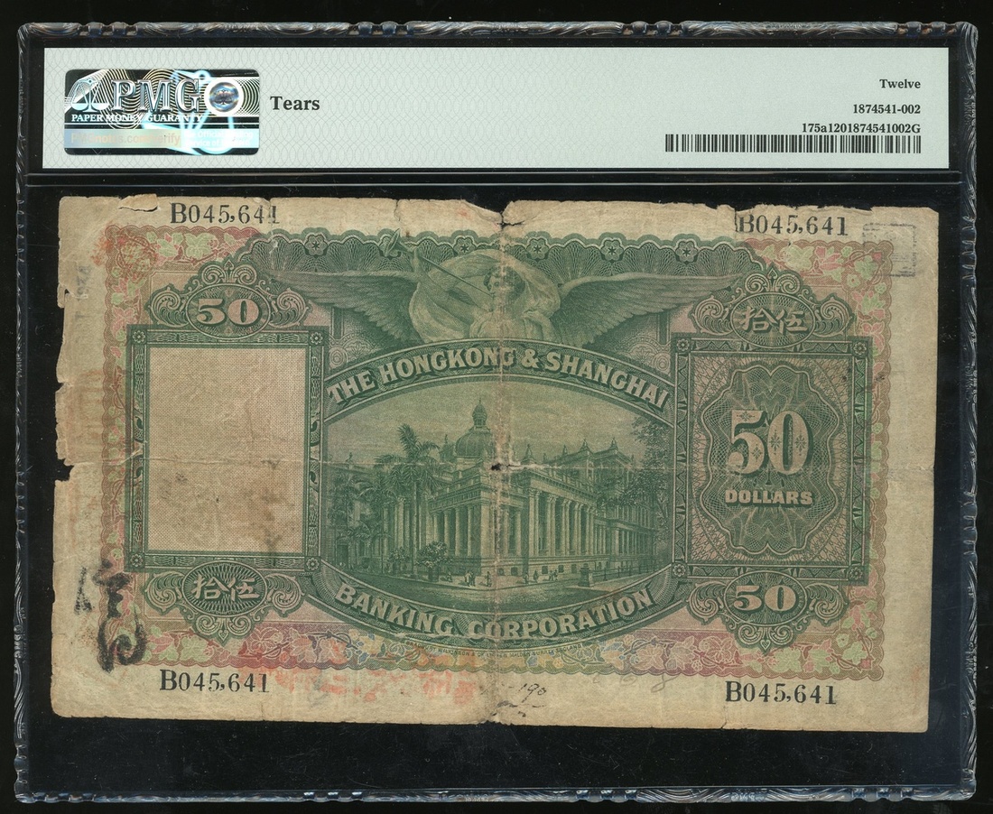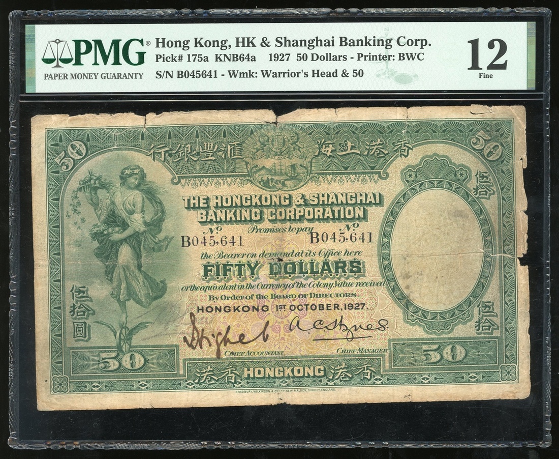The Hongkong and Shanghai Banking Corporation, $50, 1.10.1927, serial number B045641, (Pick 175a), PMG 12 Fine (Tears). A scarcer first date of issue.