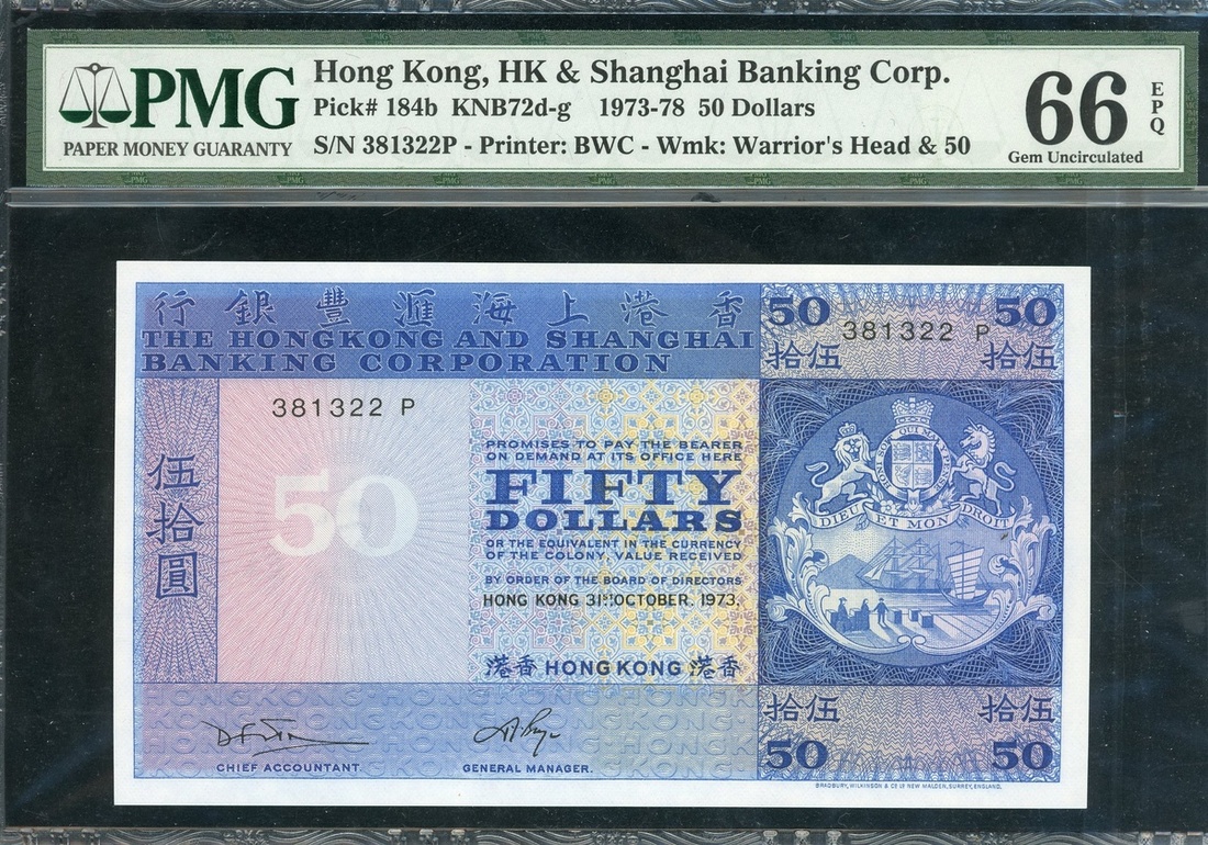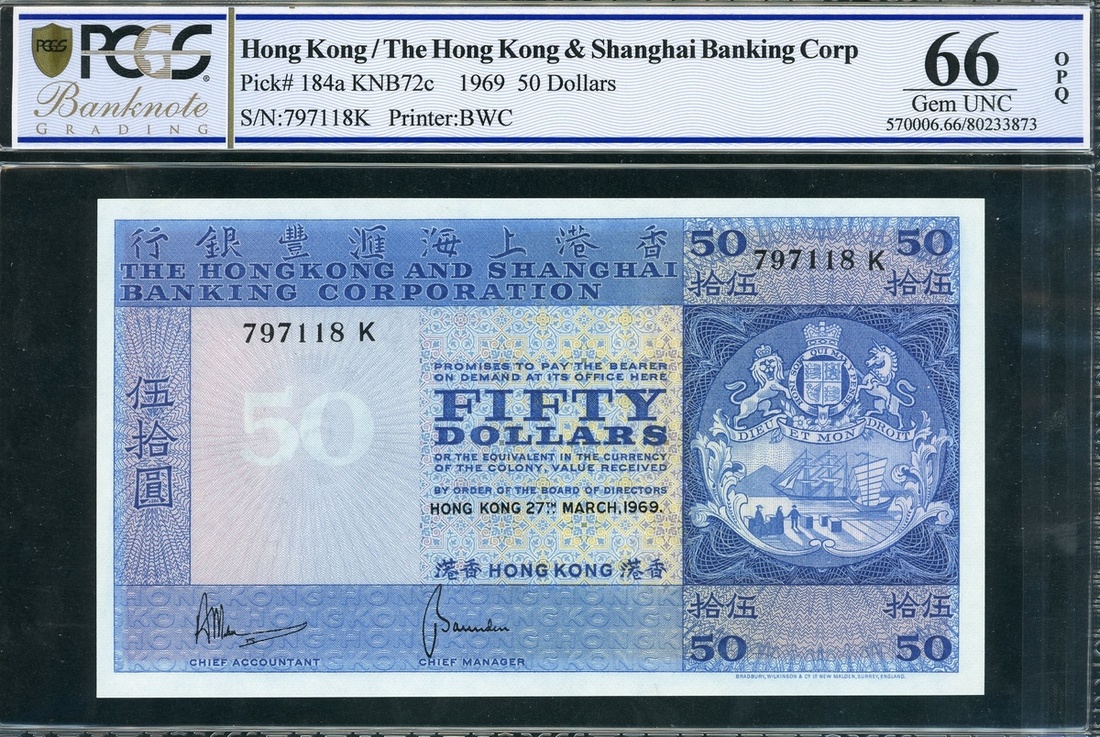 The Hongkong and Shanghai Banking Corporation, a pair of $50, 27.3.1969 and 31.10.1973, serial numbers 797118 K and 381332 P, (Pick 184a, 184b), graded PCGS Banknote 66OPQ and PMG 66EPQ respectively (2)
