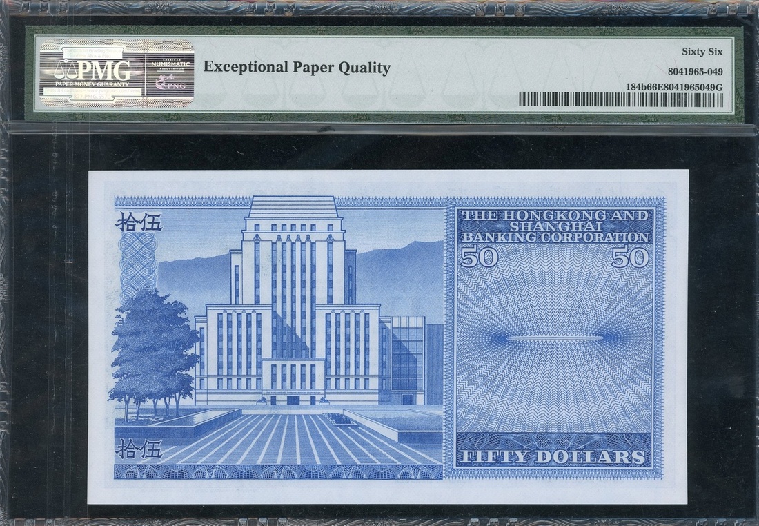 1969及1973年香港匯豐銀行50元,編號 797118 K及381332 P,分別評PCGS Banknote 66OPQ及PMG 66EPQ
