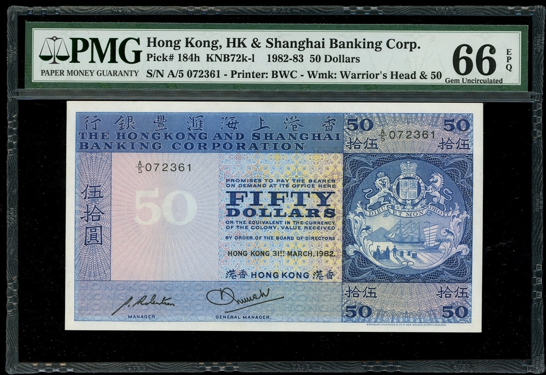 The Hongkong and Shanghai Banking Corporation, $50, 31.3.1982, serial number A/5 072361, (Pick 184h), PMG 66EPQ Gem Uncirculated