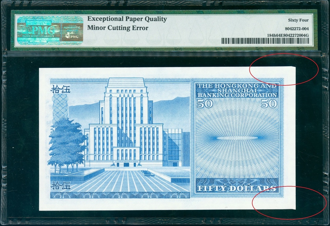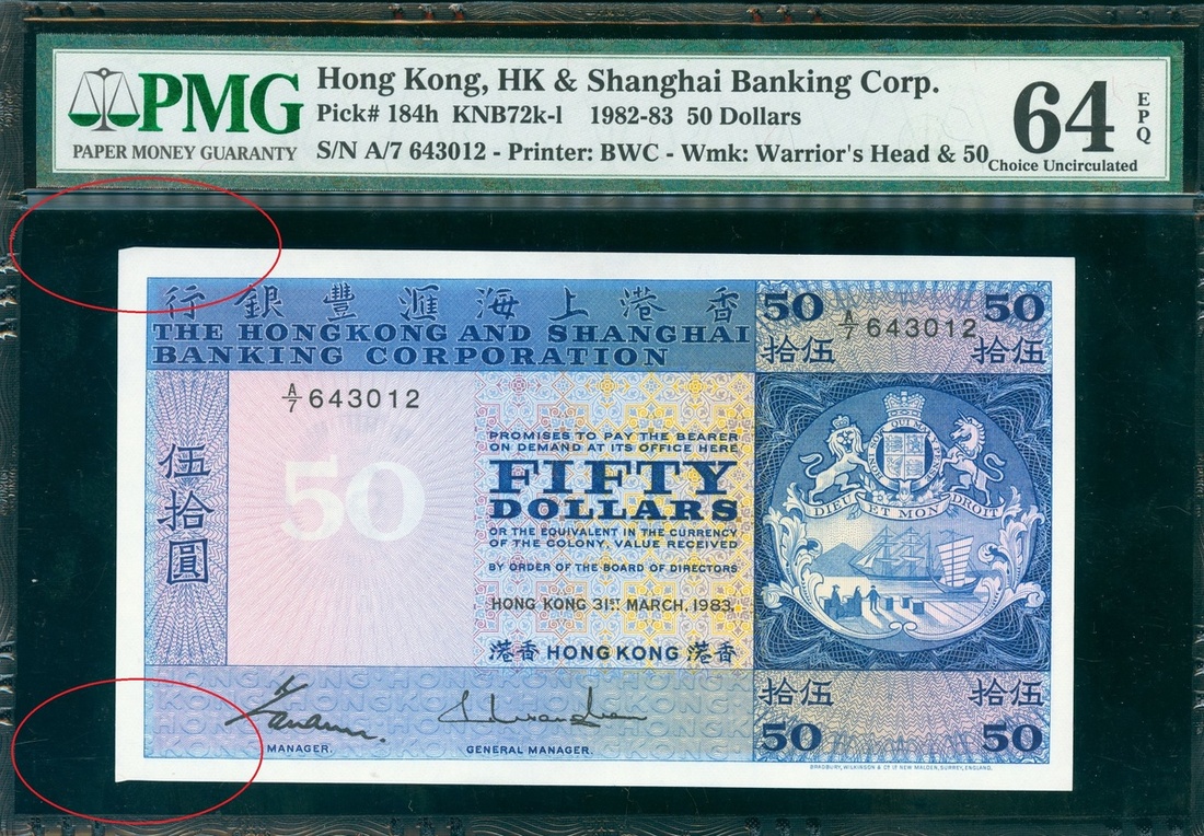 1983年香港匯豐銀行 50元,輕微裁剪錯體,編號 A/7 643012,PMG 64EPQ