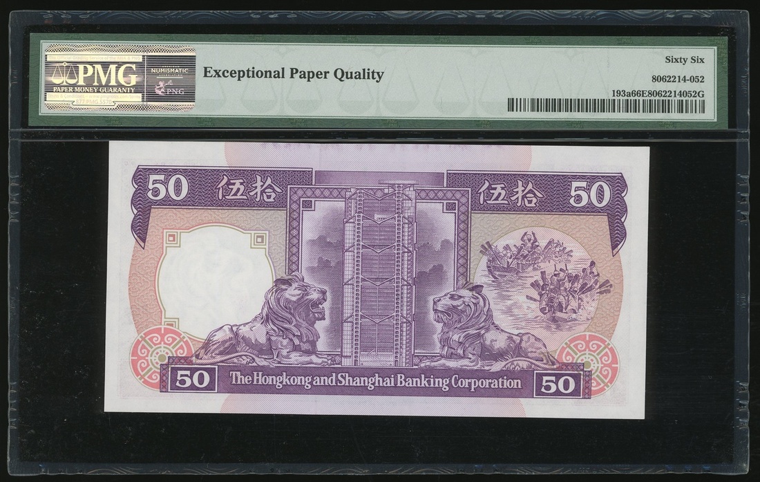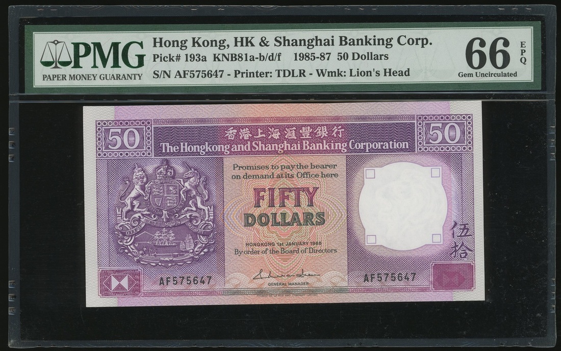 The Hongkong and Shanghai Banking Corporation, $50, 1.1.1986, serial number AF575647, (Pick 193a), PMG 66EPQ Gem Uncirculated