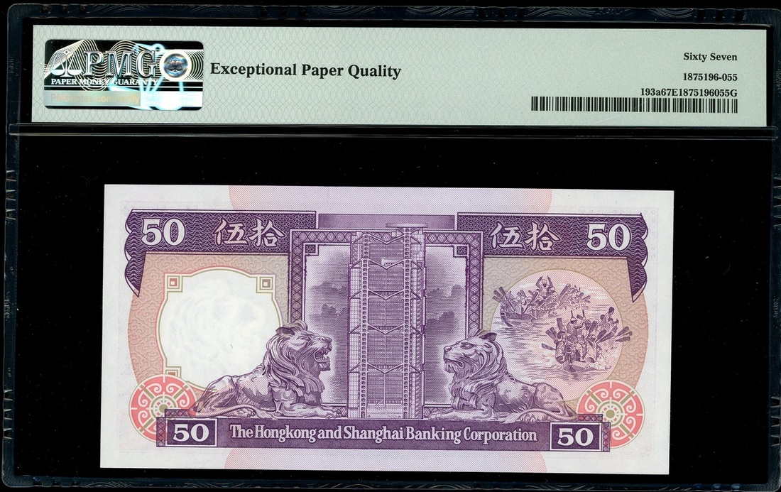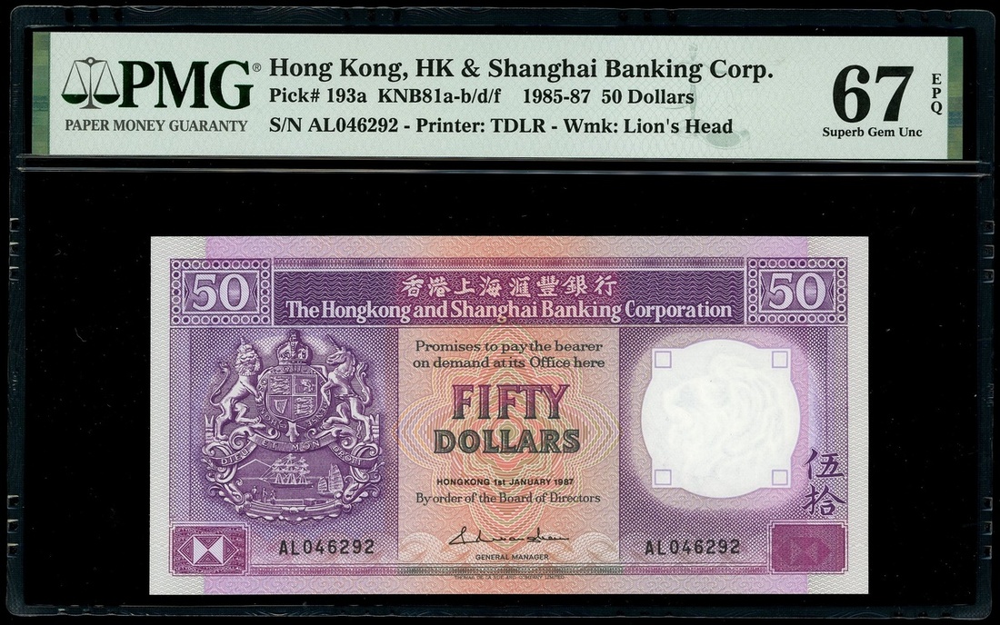 The Hongkong and Shanghai Banking Corporation, $50, 1.1.1987, serial number AL046292, (Pick 193a), PMG 67EPQ Superb Gem Uncirculated