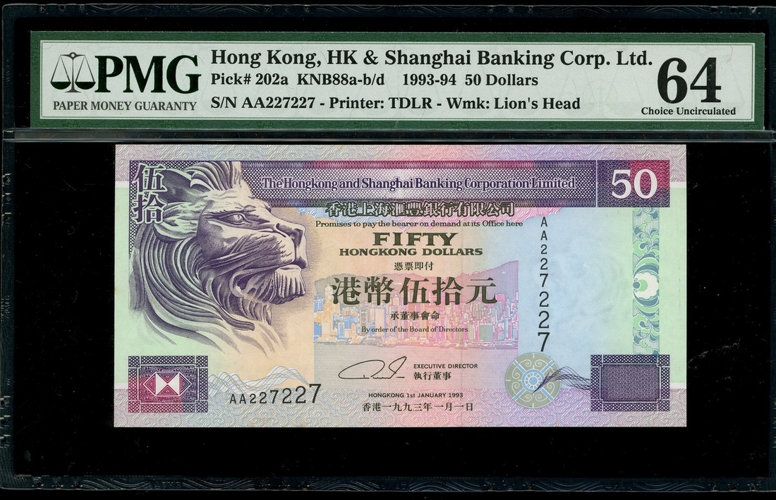 The Hongkong and Shanghai Banking Corporation, $50, 1.1.1993, first prefix repeater serial number AA227227, (Pick 202a), PMG 64 Choice Uncirculated.