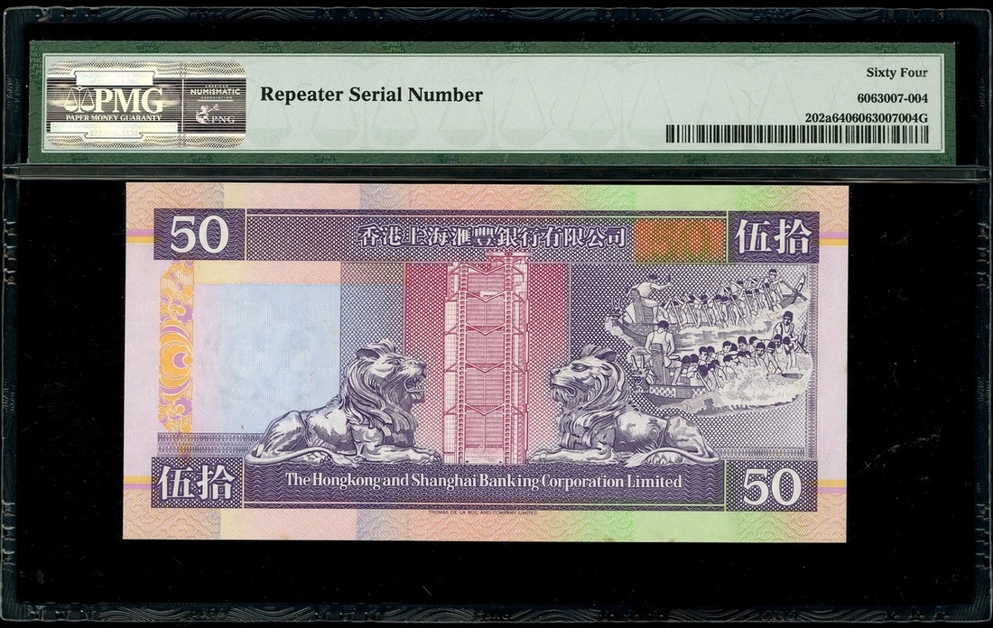 1993年香港匯豐銀行 50元,首字軌重複號 AA227227,PMG 64