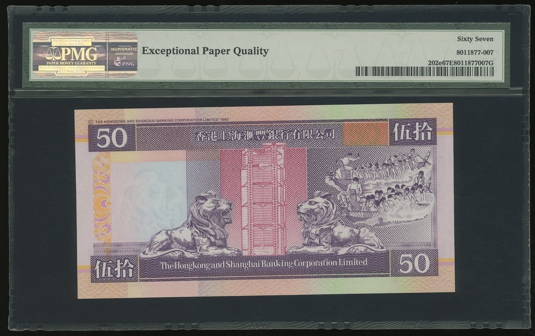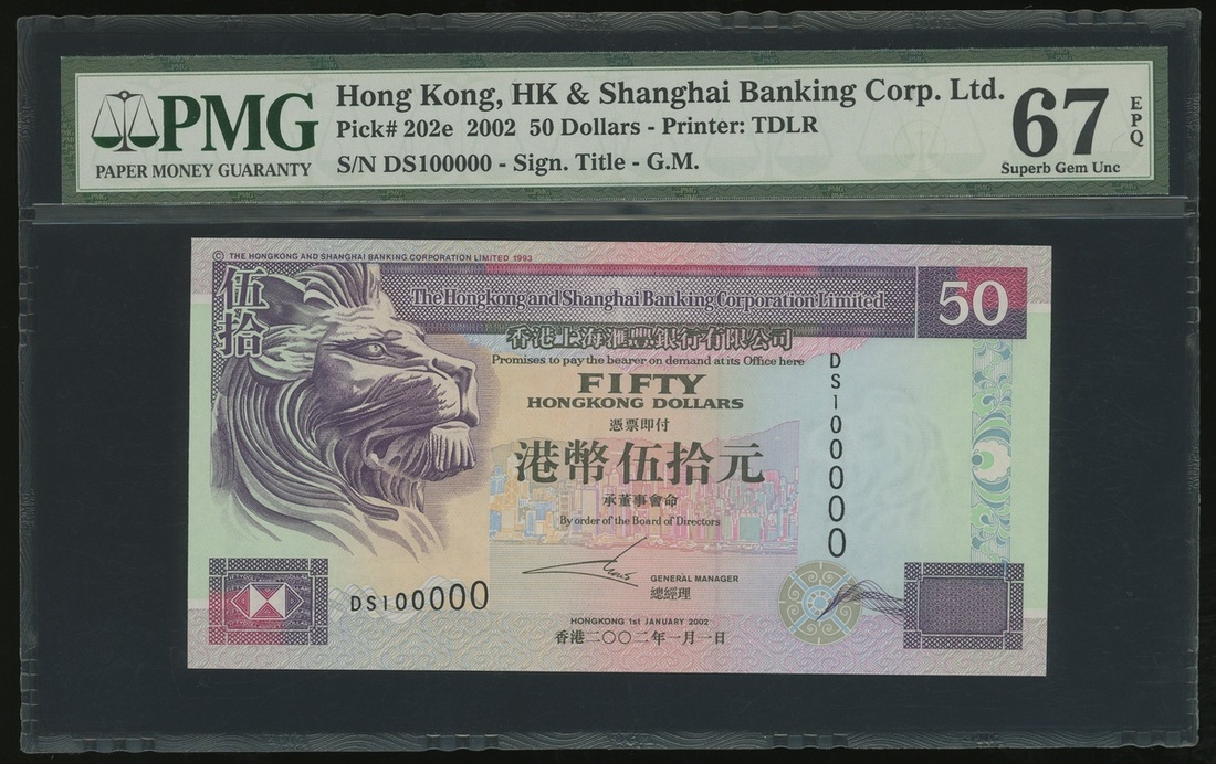 The Hongkong and Shanghai Banking Corporation, $50, 1.1.2002, fancy serial number DS100000, (Pick 202e), PMG 67EPQ Superb Gem Uncirculated.