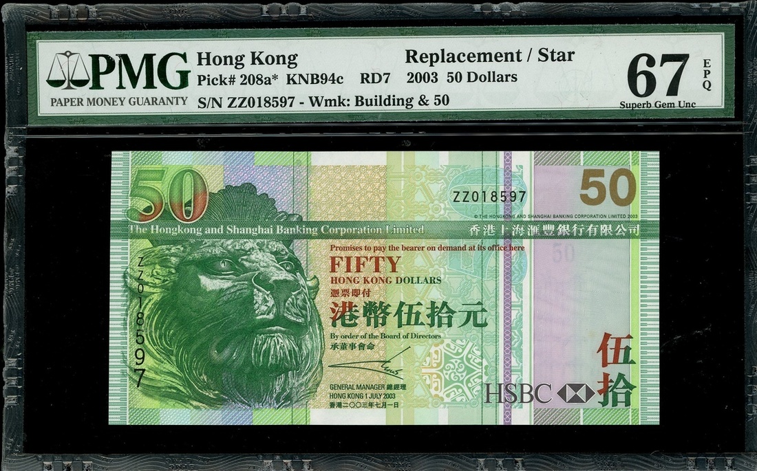The Hongkong and Shanghai Banking Corporation, $50, 1.7.2003, replacement serial number ZZ018597, (Pick 208a*), PMG 67EPQ Superb Gem Uncirculated, a scarcer replacement date.