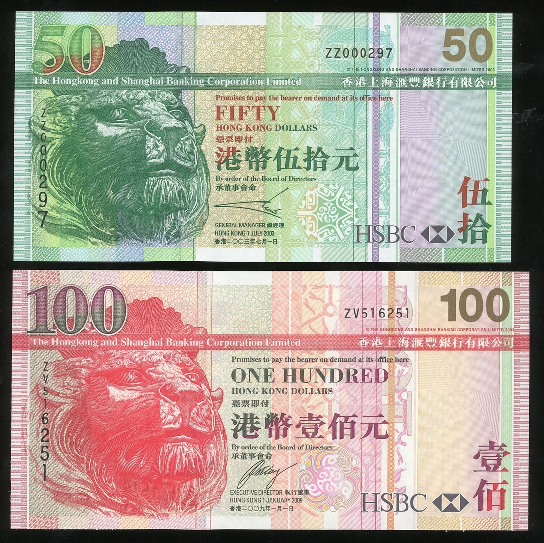 香港匯豐銀行補版一組3枚,包括2003年50元,2009年100元及500元,編號 ZZ000297,ZV516251 及ZX331431,均UNC
