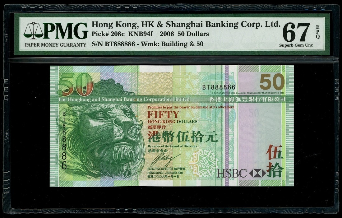 The Hongkong and Shanghai Banking Corporation, $50, 1.1.2006, near-solid serial number BT888886, (Pick 208c), PMG 67EPQ Superb Gem Uncirculated