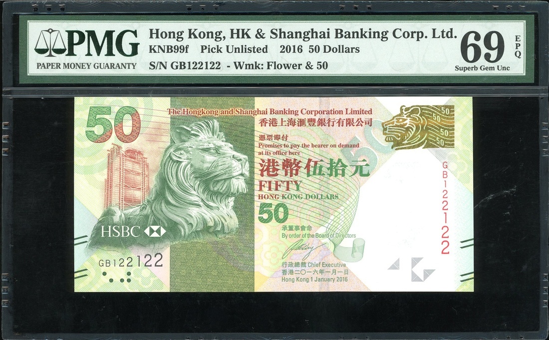 2016年香港匯豐銀行 50元,重複號 GB122122,PMG 69EPQ