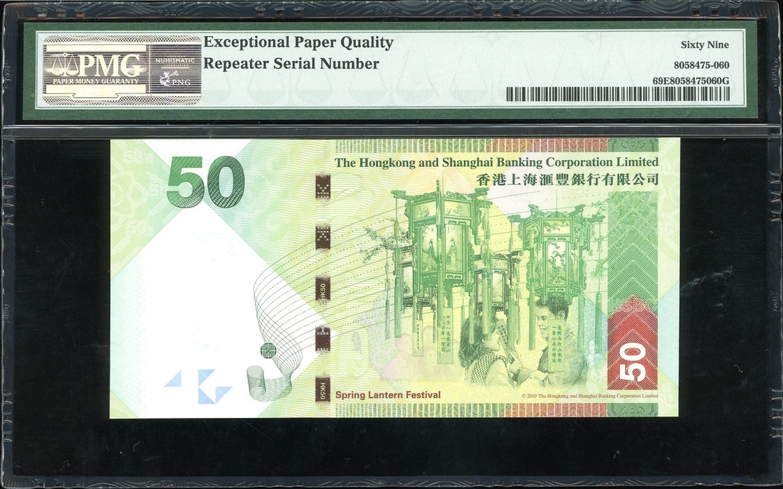 The Hongkong and Shanghai Banking Corporation, $50, 1.1.2016, repeater serial number GB122122, (Pick 213e), PMG 69EPQ Superb Gem Uncirculated