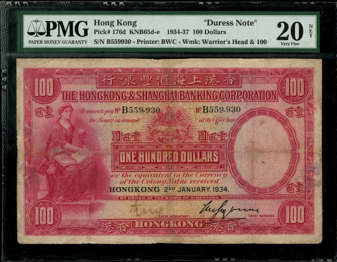The Hongkong and Shanghai Banking Corporation, $100, 1.2.1934, DURESS NOTE, serial number B559930, handsigned signature at lower left,