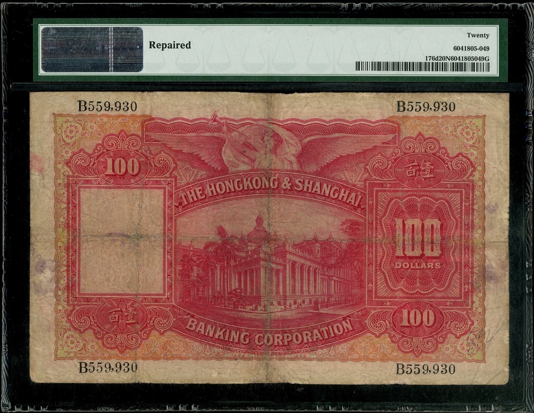1934年香港匯豐銀行 100元,逼簽票,編號 B559930,左下有手簽署名,PMG 20NET,有修補