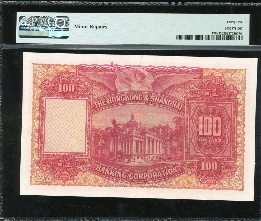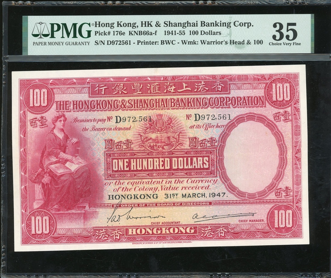 The Hongkong and Shanghai Banking Corporation, $100, 31.3.1947, serial number D972561, (Pick 176e), PMG 35 Choice Very Fine.