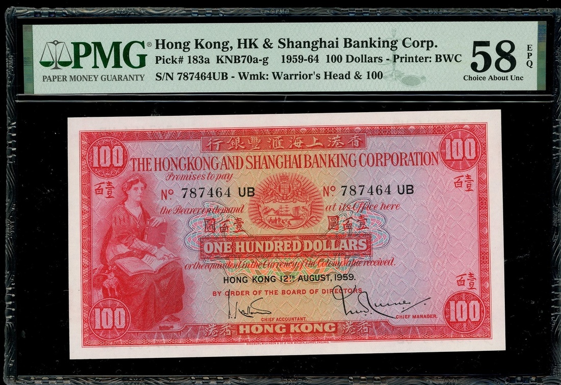 Hong Kong & Shanghai Banking Corporation, $100, 12.8.1959, serial number 787464UB, (Pick 183a), PMG 58EPQ.